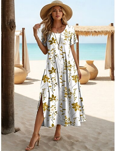 Naisten Polvipituinen mekko Kesämekko Tpaitamekko A linjainen mekko Loma Vapaa-aika Boheemi Hiekkaranta Normaali Kukka Kuvitettu Lyhythihainen V kaula-aukko Sininen Keltainen Punastuvan