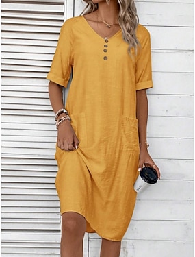 Naisten Midimekko Keinopuuvillainen pellava Väljä mekko Kaftaanimekko Muoti Klassinen Loma Bile Viikonloppu Normaali Tavallinen Lyhythihainen Paitapuserokaula-aukko Vaalea vaaleanpunainen Keltainen