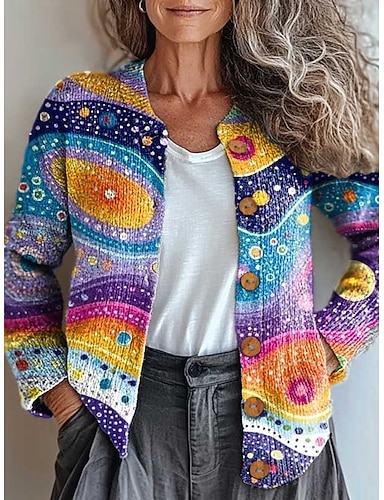 Naisten neulecardigan ribbattu nappikiinnitys pyöreä kaula-aukko pitkät hihat kevyt päivittäinen kukkagraafinen geometrinen nappi printti regular yläosat neulottu ulkoilu viikonloppu violetti vihreä