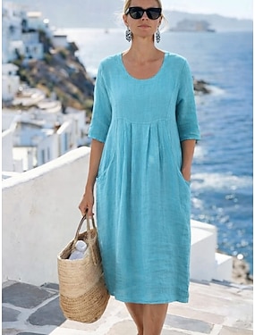 Naisten pellavajäljitelmä midimekko, pitkähihainen, kesämekko, rento, päivittäinen väljä istuvuus, yksivärinen, puolihiha, pyöreä pääntie, sininen, fuksianvihreä, tummansininen, kesä kevät