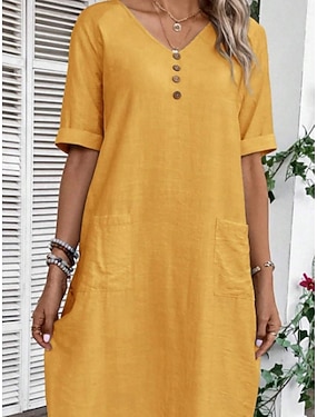 Naisten Polvipituinen mekko Keinopuuvillainen pellava Rento mekko Tyylikäs Muoti Moderni ulko- Loma Bile Loose Fit Tavallinen Lyhythihainen V kaula-aukko Sininen Keltainen Rubiini Purppura Kesä Kevät
