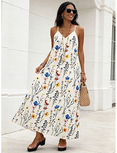 Naisten Maksimekko Kesämekko A linjainen mekko Slip Mekko Loma Vapaa-aika Hiekkaranta Bile Loose Fit Kuvitettu Trooppinen Hihaton V kaula-aukko Musta Valkoinen Kesä Kevät