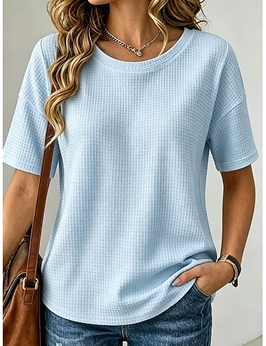 Naisten T-paita Vohvelineuletoppit Yhtenäinen väri Muoti Klassinen Vapaa-aika Lyhythihainen Pyöreä kaula-aukko Tavalliset topit Päivittäin Bile Viikonloppu Keltainen Punastuvan vaaleanpunainen