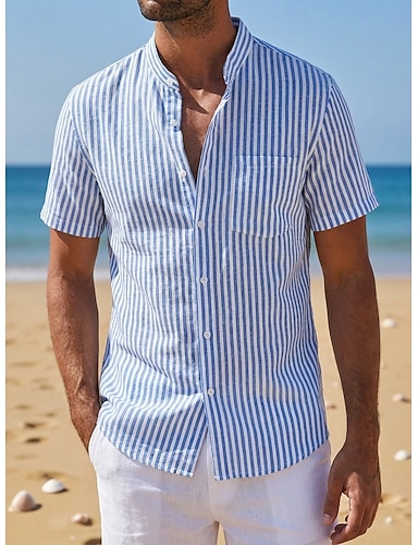 Miesten Paita Pellava paita Kesä paita Rantapaita Pystysuuntaiset nauhat Kausaliteetti Päivittäin Sininen Punastuvan vaaleanpunainen Lyhythihainen Pystykaulus Kesä Kevät Vaatetus