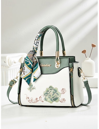 Naisten kirjailtu kukkakuvioinen käsilaukku huivikorostuksella, keinonahkaa, useita värejä, elegantti rento tyyli, täydellinen jokapäiväiseen käyttöön, toimistoon ja sosiaalisiin tilaisuuksiin