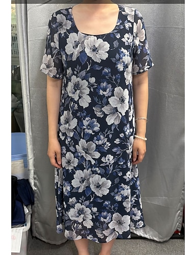 Naisten Midimekko Väljä mekko Tyylikäs Päivittäin Häävieras Normaali Kukka Kuvitettu Lyhythihainen Tiukka pyöreä kaula-aukko Laivaston sininen