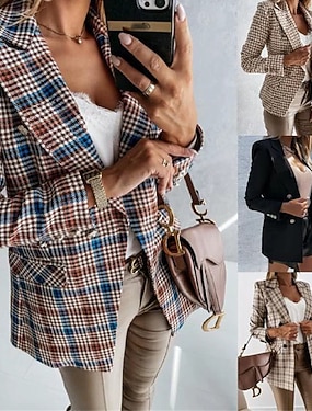 Naisten Bleiseri Mukava Tasku Tyylikäs Muoti Ulkoilma Ruutukuvio Bile Rento / arki Viikonloppu Kaksirivinen Normaali Kauluskäänne Normaali Pitkähihainen Päällysvaatteet Musta Khaki Aprikoosi Kevät