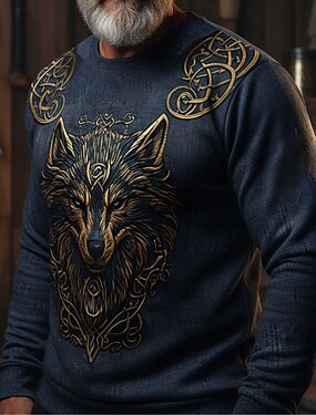 Miesten College Sininen Musta Tiukka pyöreä kaula-aukko Susi Kelttiläinen solmu Painettu Kausaliteetti Päivittäin Katuvaatteet Vintage Viikinki Syksy Talvi Vaatetus Hupparit paidat Pitkähihainen