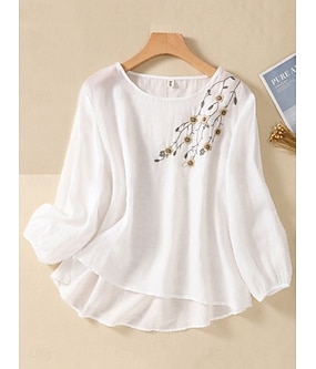 Naisten Paita Puuvillaiset pellavapaidat Pusero Keinopuuvillainen pellava Kirjailtu Kukka Tyylikäs Vapaa-aika Pitkähihainen Tiukka pyöreä kaula-aukko Tavalliset topit Päivittäin Sininen Valkoinen