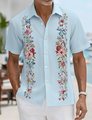 Miesten Kukkapainatus Etninen Kukat Paita Guayabera paita Button Up paita Lyhythihainen Vintage retro Loma Rento / arki Kesä Kevät Sänkyjen avaus 3D-tulostus Pellava kuin paita Sininen Punastuvan