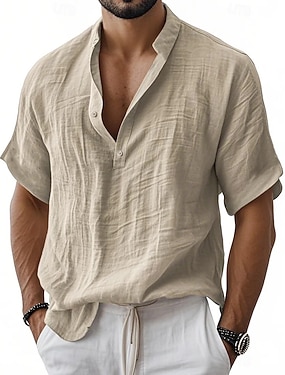 Miesten pellava paita Band kauluspaita Kesä paita Ranta-asut Yhtenäinen väri Päivittäin Havaijilainen Musta Valkoinen Viini Laivaston sininen Pitkähihainen Henley 봄 & Syksy Vaatetus kauluspaidat