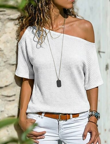 Naisten T-paita Reikä Kuvitettu Tavallinen Muoti Tyylikäs Klassinen Lyhythihainen Epäsymmetrinen Venekaula-aukko Tavalliset topit Päivittäin Bile Viikonloppu Musta Valkoinen Laivaston sininen Ruskea