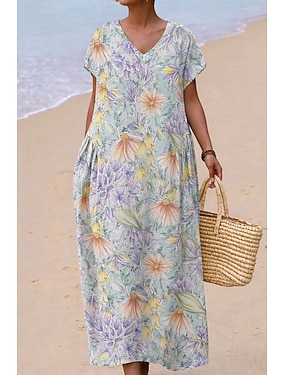 Naisten maksi-mekko pellavan kaltainen hengittävä kevyt auringonkukka A-linjainen mekko lomarento boho ranta löysä istuvuus kukkagraafinen geometrinen 3/4 pituus hiha V-kaula-aukko sininen valkoinen