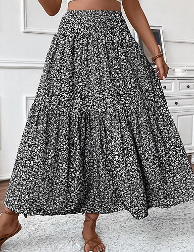 Naisten Lomahame söpö tyyli Vapaa-aika Maxi Keski vyötärö Hameet Kukka Rypytetty Painettu Elastinen Katu Bile Musta Kesä Polyesteri