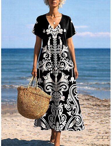 Naisten Mini mekko Kesämekko Tpaitamekko Loma Vapaa-aika Boheemi Bile Normaali Kuvitettu Paisley-kuvio Lyhythihainen V kaula-aukko Musta kulta Saarni Musta Rubiini Kesä Kevät