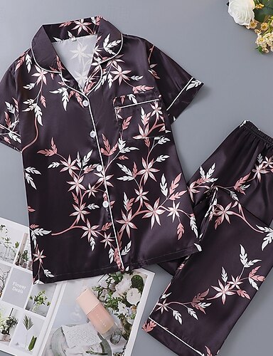 Naisten loungewear Yöpukusarja Muoti Yksinkertainen Vapaa-aika Kukka Kuvitettu Eläin Satiini Silky Pyjama Pyjama Joustava vyötärö Napit Housut Koti Loma Lyhythihainen Paitapuserokaula-aukko Vaalea