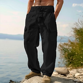 Miesten Reisitaskuhousut Pellavahousut Housut Shortsit Kesähousut Kurenauha Joustava vyötärö Monitasku Tavallinen Mukavuus Hengittävä Täyspitkä Kausaliteetti Päivittäin Pyhäpäivä Loma Muoti Musta