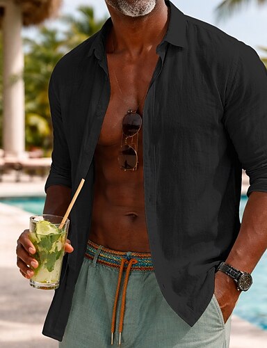 Miesten Paita Pellava paita Kesä paita Ranta-asut Rantapaita Button Up paita Väripalikka Loma Pyhäpäivä Sininen Musta Valkoinen Punastuvan vaaleanpunainen Pitkähihainen Sänkyjen avaus Kesä Kevät