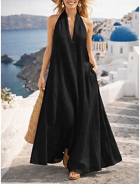 Naisten maksimekko puuvillaa ja pellavaa, kauluspaitamekko, vapaa-ajan mekko, tyylikäs muoti moderni ulko-, loma, bile, väljä istuvuus, yksivärinen, lyhythihainen, pystykaulus, sininen, musta, punainen, vihreä, kesä, kevät