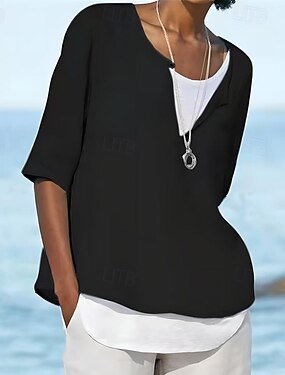 Naisten Paita Puuvillaiset pellavapaidat Tavallinen Päivittäin Tyylikäs Perus 3/4 hiha V kaula-aukko Tavalliset topit Päivittäin Työ Pyhäpäivä Sininen Musta Valkoinen Kevät Syksy