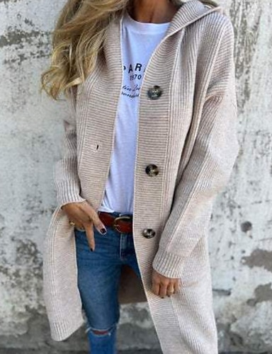 Naisten Neuletakki Tyylikäs Vapaa-aika Pehmeä Puhdas väri Paksu Hupullinen Napit Kudottu Hupullinen Pitkähihainen Pitkät topit Neuloa ulko- Päivittäin Pyhäpäivä Keltainen Rubiini Syksy Talvi