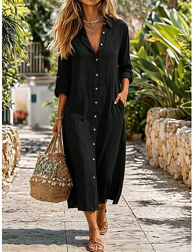 Naisten Midimekko Puuvillaiset pellavamekot Väljä mekko Perus Päivittäin Loose Fit Tavallinen Pitkähihainen Paitapuserokaula-aukko Musta Valkoinen Vaalean ruskea Oranssi Kesä Kevät Syksy