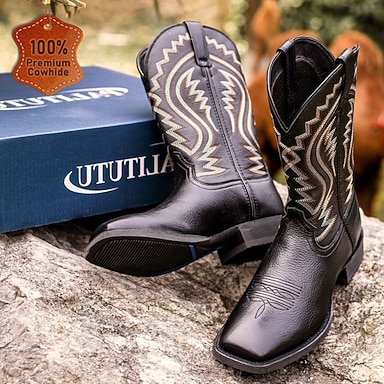 Miesten mustat lännentyyliset cowboy-saappaat – ensiluokkaista nahkaa, jossa on monimutkaiset tikkaukset ja kestävä pohja, täydelliset lännentyyliin, vapaa-aikaan ja rodeotapahtumiin