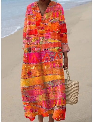 Naisten Maksimekko Kesämekko Väljä mekko Loma Vapaa-aika Hiekkaranta Bile Loose Fit Kuvitettu Geometrinen Abstrakti Pitkähihainen V kaula-aukko purppura Appelsiinin punainen Fuksia Kesä Kevät Syksy