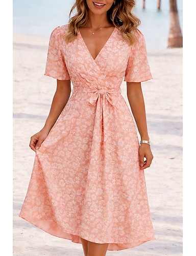 Pääsiäisen naisten tyylikäs midi-mekko A-linjainen mekko kietaisumekko V-mallinen lyhythihainen ulkomekko säännöllinen istuvuus kukkakuva sininen purppura oranssi vihreä