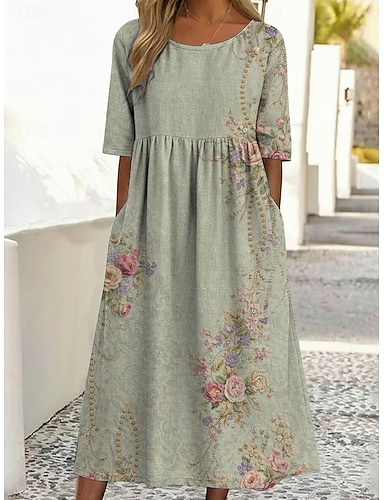 Naisten Midimekko Rento mekko Painatus mekko Vintage ulko- Loma Bile Loose Fit Kukka Kuvitettu Puolihiha Tiukka pyöreä kaula-aukko Sininen Vaalea purppura Purppura Apila Kesä Kevät