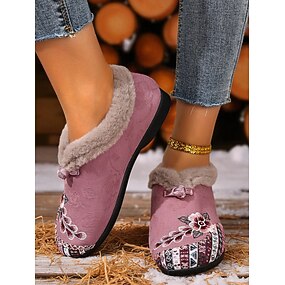 Naisten punaiset kirjaillut turkisvuoratut slip-on-kengät kukkakuviolla, lämpimät talvikengät jouluun, lomakauteen ja vapaa-aikaan