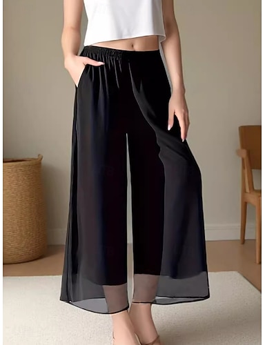 Naisten Kiinalainen Kesähousut Rantahousut Tyylikäs Muoti Katutyyli Täyspitkä Keskikorkea vyötärö Yhtenäinen väri Tilkkutäkki Läpinäkyvä Elastinen vyötärönauha Mukava Hengittävä Mikrojoustava