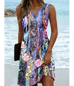Naisten minimekko rento mekko kesämekko elegantti rento loma päivittäinen loma säännöllinen istuvuus kukkakuvio boho paisley damask olkaimeton V-pääntie fuksia kesä kevät