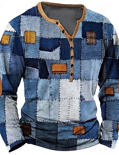 Miesten Faux Patchwork kuvio T-paita Henley-paita T-paidat Pitkähihainen Vintage Suunnittelija Tyylikäs Kausaliteetti Päivittäin ulko- Kevät kesä Kaikki vuodenajat Sininen Henley Henley T-paita