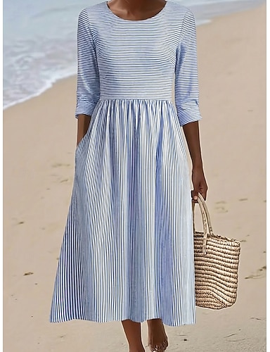 Naisten Midimekko Rento mekko Puuvillamekko A linjainen mekko Muoti Moderni Päivittäin Loma Pyhäpäivä Normaali Raidoitettu 3/4 hiha Tiukka pyöreä kaula-aukko Vaalean sininen Kesä Kevät
