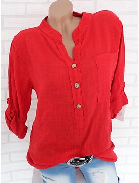 Naisten Pellava paita Kesä paita Button Up paita Keinopuuvillainen pellava Tasku Yhtenäinen väri Tavallinen Päivittäin Tyylikäs Vapaa-aika Pitkähihainen V kaula-aukko Tavalliset topit Pyhäpäiv