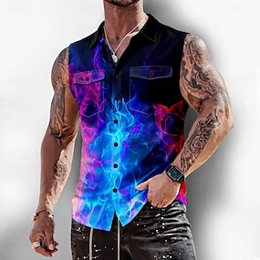 Miesten 3D Print Liekki Neonhehku Paita Button Up paita Hihaton paita Hihaton Muoti rento ulko- Loma Kesä Kevät Sänkyjen avaus 3D-tulostus Kaksi etutaskua Musta / Purppura Musta ja sininen Musta