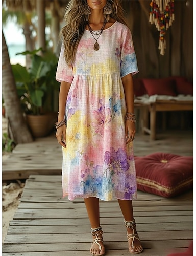 Naisten Midimekko Keinopuuvillainen pellava Boho-mekko Väljä mekko Rento mekko Tyylikäs Päivittäin ulko- Hiekkaranta Loose Fit Kukka Puolihiha Tiukka pyöreä kaula-aukko Punastuvan vaaleanpunainen