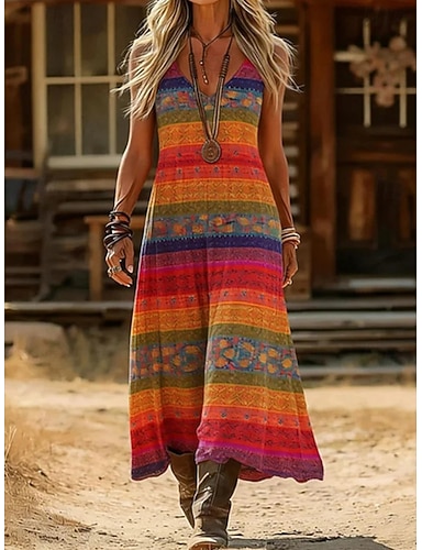 Naisten Maksimekko Boho-mekko Vintage mekko Rento mekko Vintage Pyhäpäivä Loose Fit Boheemi Kukka Kuvitettu Hihaton V kaula-aukko Sininen Rubiini Oranssi Kesä Kevät