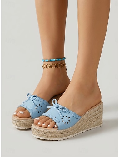 Naisten vaaleansiniset espadrille-kiilakorkoiset sandaalit - tyylikkäät laserleikatut liukukengät rusettiyksityiskohdilla ylellisiin risteilylomiin, kesäisiin kansijuhliin &trooppinen