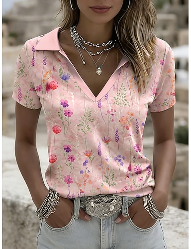 Naisten T-paita Painettu Kukka Kuvitettu Tyylikäs Klassinen Vapaa-aika Lyhythihainen Pikeepaita Tavalliset topit Kausaliteetti Päivittäin Urheilu Sininen Punastuvan vaaleanpunainen Purppura Apila