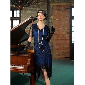 Möly 20s 1920-luku Polvipituinen Mekko Coctail-asu Lyhyet hihat Suuri Gatsby Flapper tyttö Paljetti Hapsut V kaula-aukko Naamiaispuku Naisten Joulu Karnevaali Iltajuhlat Häät salakapakka Aikuisten