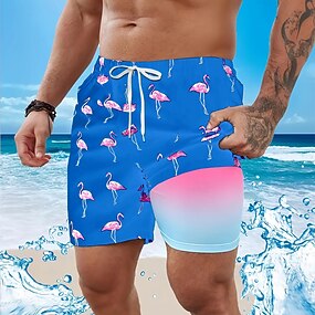 Miesten Flamingo Lintu Vuoratut shortsit 2 in 1 uimashortsit Uimashortsit Keskivyötärö Havaijilainen Loma Pyhäpäivä Ranta-asut Sivutaskut Compression Linerin kanssa Joustava kiristysnyöri vyötäröllä