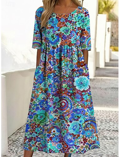 Naisten Midimekko Kesämekko Loma Vapaa-aika Boheemi Päivittäin Hiekkaranta Normaali Kukka Puolihiha Tiukka pyöreä kaula-aukko Sininen Rubiini Tumman sininen Beesi Kesä Kevät