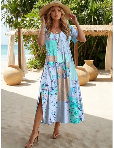 naisten maksimekko sinivalkoiset kukat loma lyhythihainen mekko loma rento ranta rantabilee kukkakuvio 3/4 hiha pyöreä kaula-aukko sininen punainen violetti vihreä