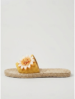 naisten keltaiset kukkakuvioiset punotut köysisandaalit - mukavat litteät rantasandaalit auringonkukkakoristelulla kesälomille, saarilomat &rento merenrantavaate