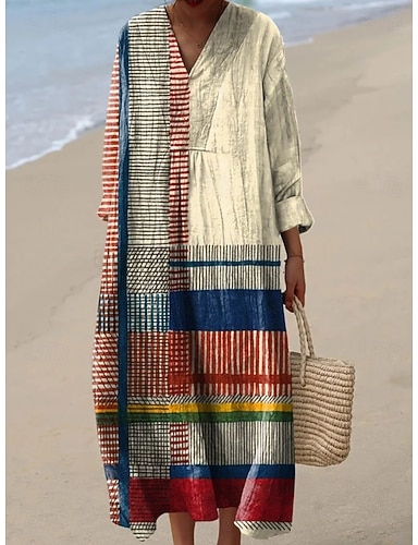 Naisten Midimekko Kesämekko A linjainen mekko Loma Vapaa-aika Boheemi Hiekkaranta Bile Loose Fit Kuvitettu Geometrinen Pitkähihainen V kaula-aukko Rubiini Purppura Apila Tumman harmaa Kevät Syksy
