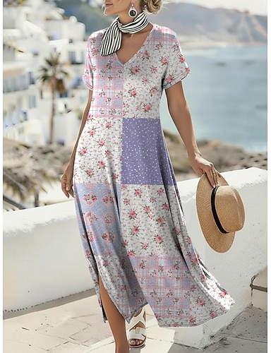 Naisten Midimekko Kesämekko A linjainen mekko Loma Vapaa-aika Boheemi Hiekkaranta Bile Normaali istuvuus Kukka Kuvitettu Lyhythihainen V kaula-aukko Sininen Vaalea purppura Kesä Kevät