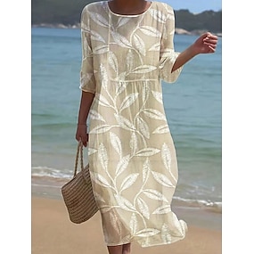 Naisten Maxi Mekko Pellon Kaltainen Hengittävä Kevyt Kaftaani 3/4 Pitkähiha Crew Neck Rento Mekko A-linjainen Mekko Boho Säännöllinen Mitoitus Graafinen Lehti Keltainen Vaaleanpunainen Sininen