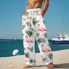 Miesten Flamingo Lintu Kookospuu Housut Rennot housut Roikkuvat housut Keskivyötärö Havaijilainen ulko- Loma Ranta-asut Joustava kiristysnyöri vyötäröllä Pellavamaiset housut taskuilla Kesä Kevät